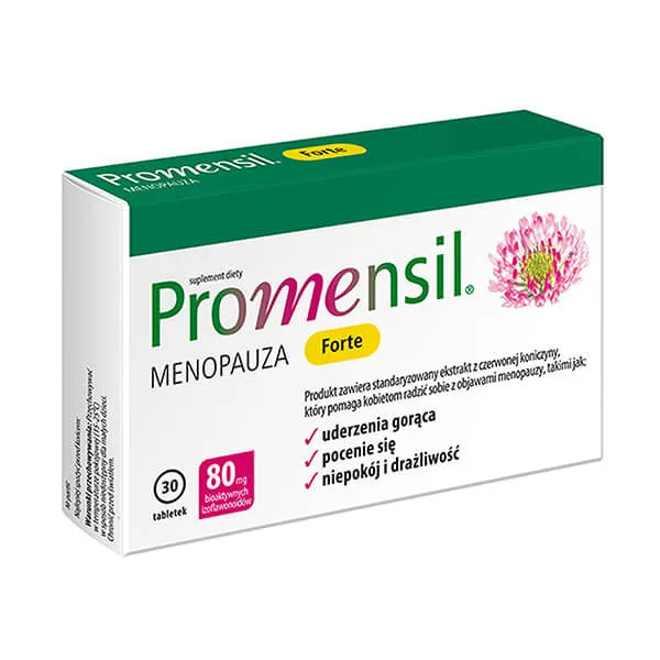 Promensil Forte to naturalny preparat, który – dzięki zawartości bioaktywnych izoflawonoidów z czerwonej koniczyny – zmniejsza objawy menopauzy, takie jak: uderzenia gorąca, nocne poty, niepokój i drażliwość. To suplement diety rekomendowany przez Polskie Towarzystwo Menopauzy i Andropauzy do stosowania przez kobiety, których jakość życia uległa istotnemu pogorszeniu z powodu objawów związanych z menopauzą, a które nie mogą lub nie chcą stosować hormonalnej terapii menopauzalnej, opartej na systemowym podawaniu estrogenów i/lub progestagenów.